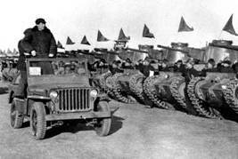 1949年3月25日,党的七届二中全会后,进京“赶考”的党中央从河北省平山县西柏坡来到北平。图为毛泽东在西苑机场检阅人民解放军装甲部队