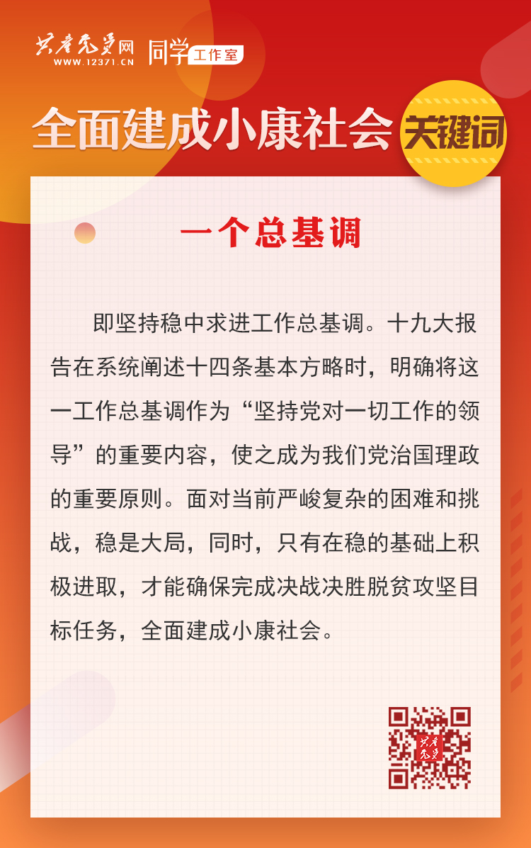 即坚持稳中求进工作总基调。十九大报告在系统阐述十四条基本方略时,明确将这一工作总基调作为“坚持党对一切工作的领导”的重要内容,使之成为我们党治国理政的重要原则。面对当前严峻复杂的困难和挑战,稳是大局,同时,只有在稳的基础上积极进取,才能确保完成决战决胜脱贫攻坚目标任务,全面建成小康社会。