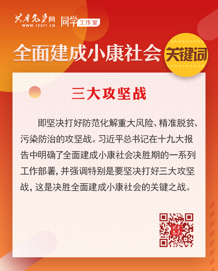 即坚决打好防范化解重大风险、精准脱贫、污染防治的攻坚战。习近平总书记在十九大报告中明确了全面建成小康社会决胜期的一系列工作部署,并强调特别是要坚决打好三大攻坚战,这是决胜全面建成小康社会的关键之战。