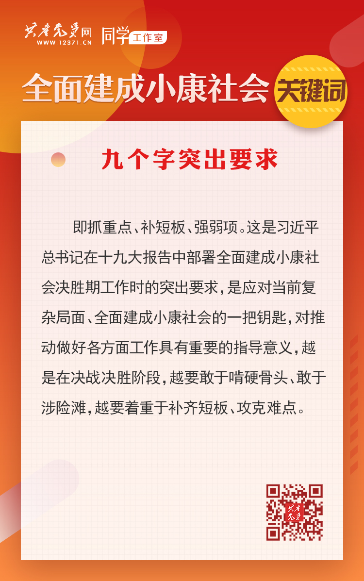 即抓重点、补短板、强弱项。这是习近平总书记在十九大报告中部署全面建成小康社会决胜期工作时的突出要求,是应对当前复杂局面、全面建成小康社会的一把钥匙,对推动做好各方面工作具有重要的指导意义,越是在决战决胜阶段,越要敢于啃硬骨头、敢于涉险滩,越要着重于补齐短板、攻克难点。
