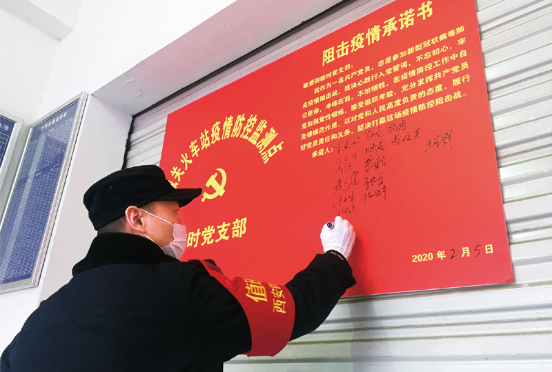 2020年2月5日,在陕西省商洛市商南站火车站,阻击疫情临时党支部成立,民警在承诺书上签名。 中新社发 张鑫/摄